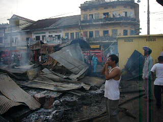 This is the scene today at Kratie market where, in the early hours of this morning, a fire started.  The main covered section of the market is all but destroyed and the flames were still burning when we visited at 6.30am.  It is a sad day for Kratie.  The market is the heartbeat of this town.  So many people will feel the impact of this on their livelihoods for years to come.  Our thoughts are with them.